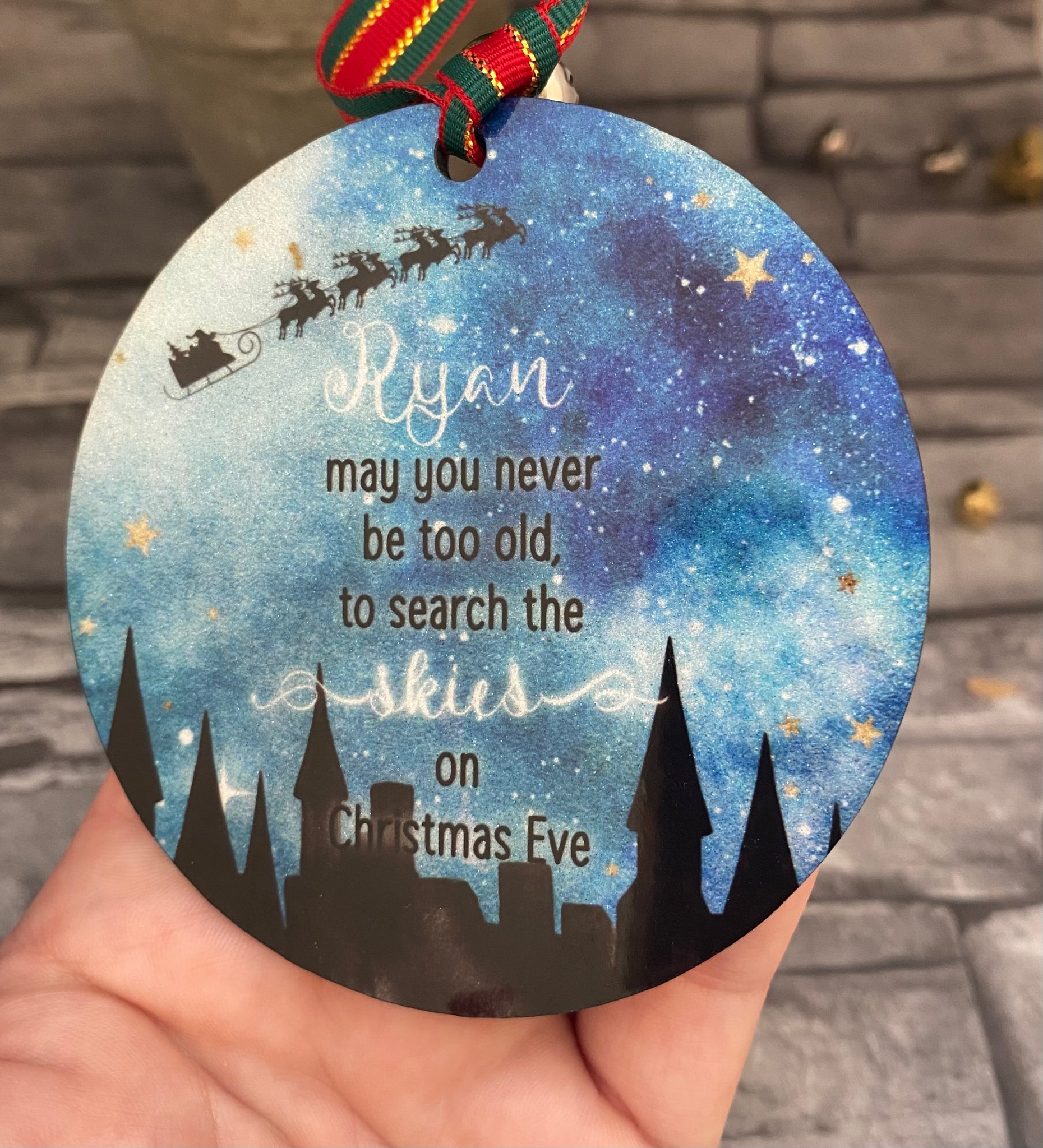 9cm glitter mdf hanging decoration featuring a gorgeous Christmasn Skyone. Any wording can be used or just a name and the year - just please specify exactly what you would like in the personalisation box.