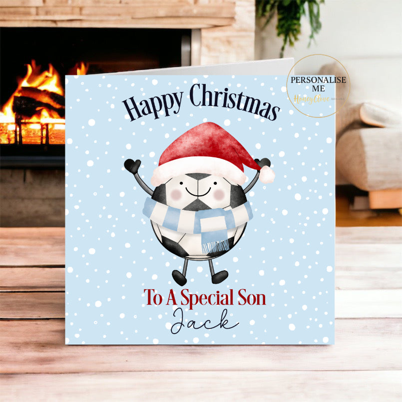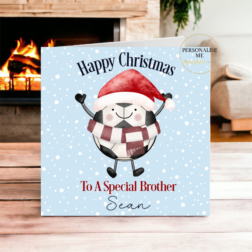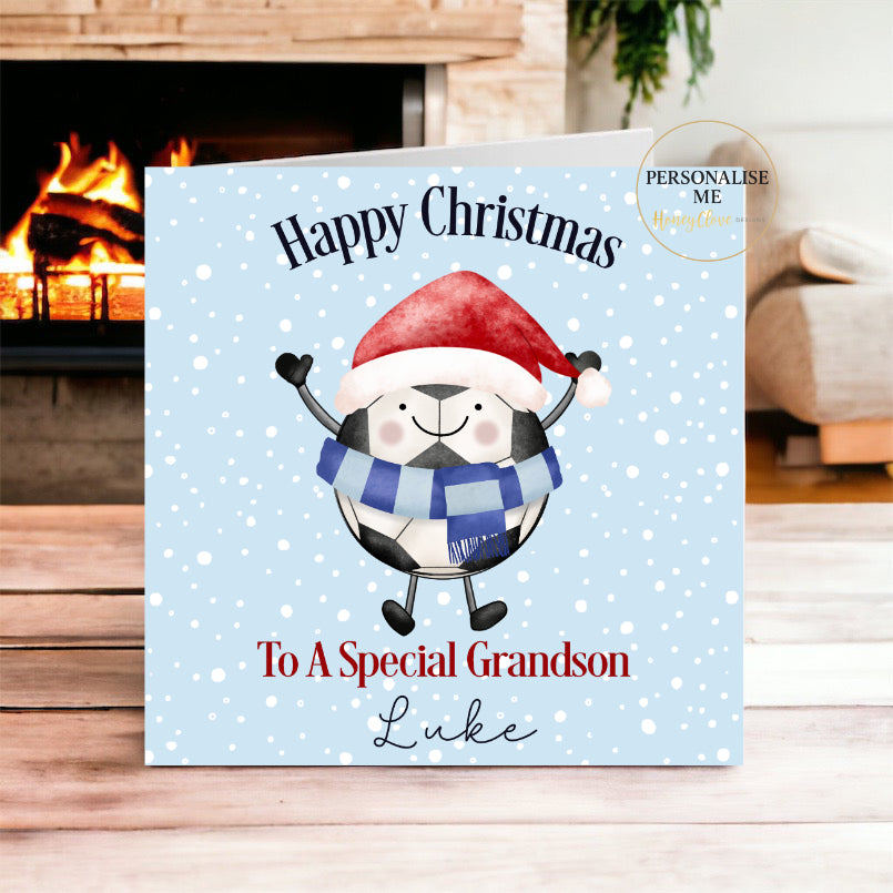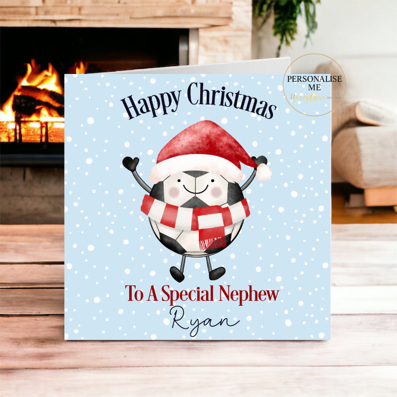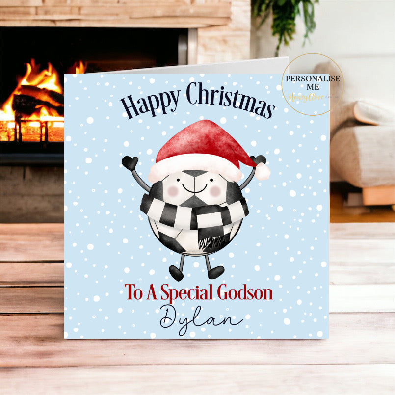 Kick off the festive season with this personalised Christmas card featuring a jolly football character in a Santa hat and scarf—perfect for sporty kids and teens! Whether it’s for a special Godson, Nephew, or Grandson, this cheerful design is sure to score big smiles.