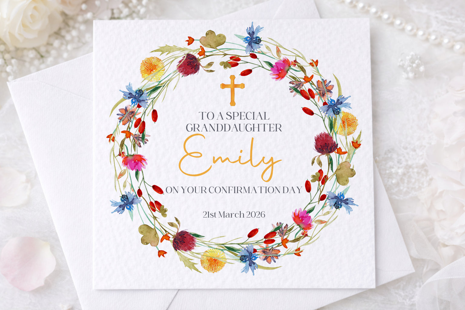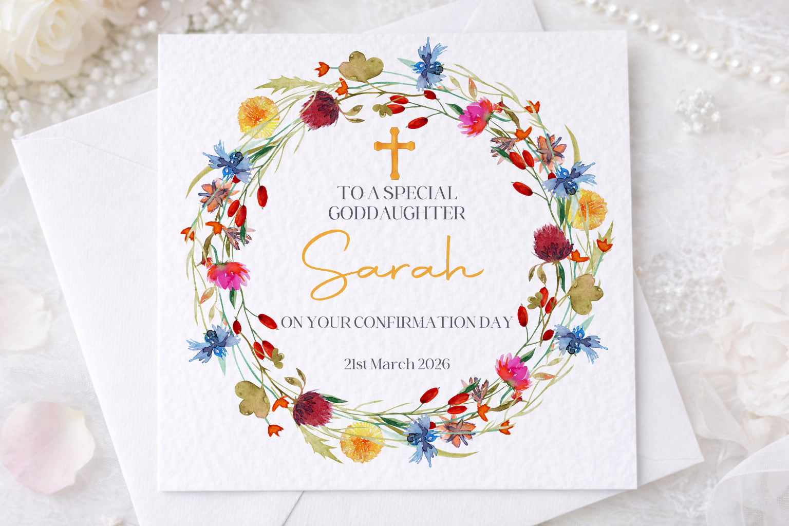 Featuring soft floral details and a subtle Christian cross, this card is a meaningful way to celebrate a Confirmation Day and makes a lovely keepsake to treasure for years to come.