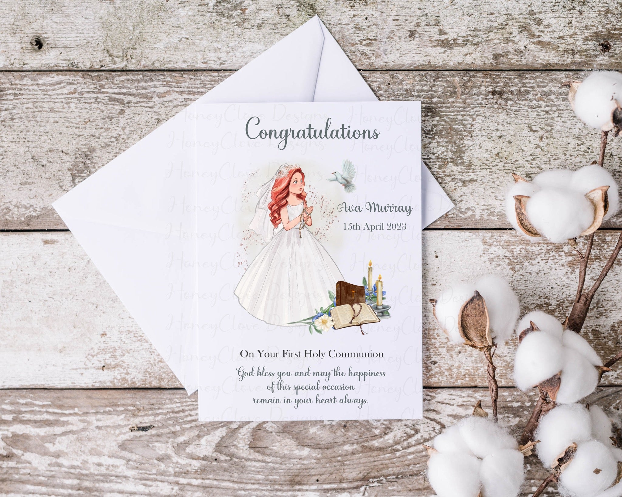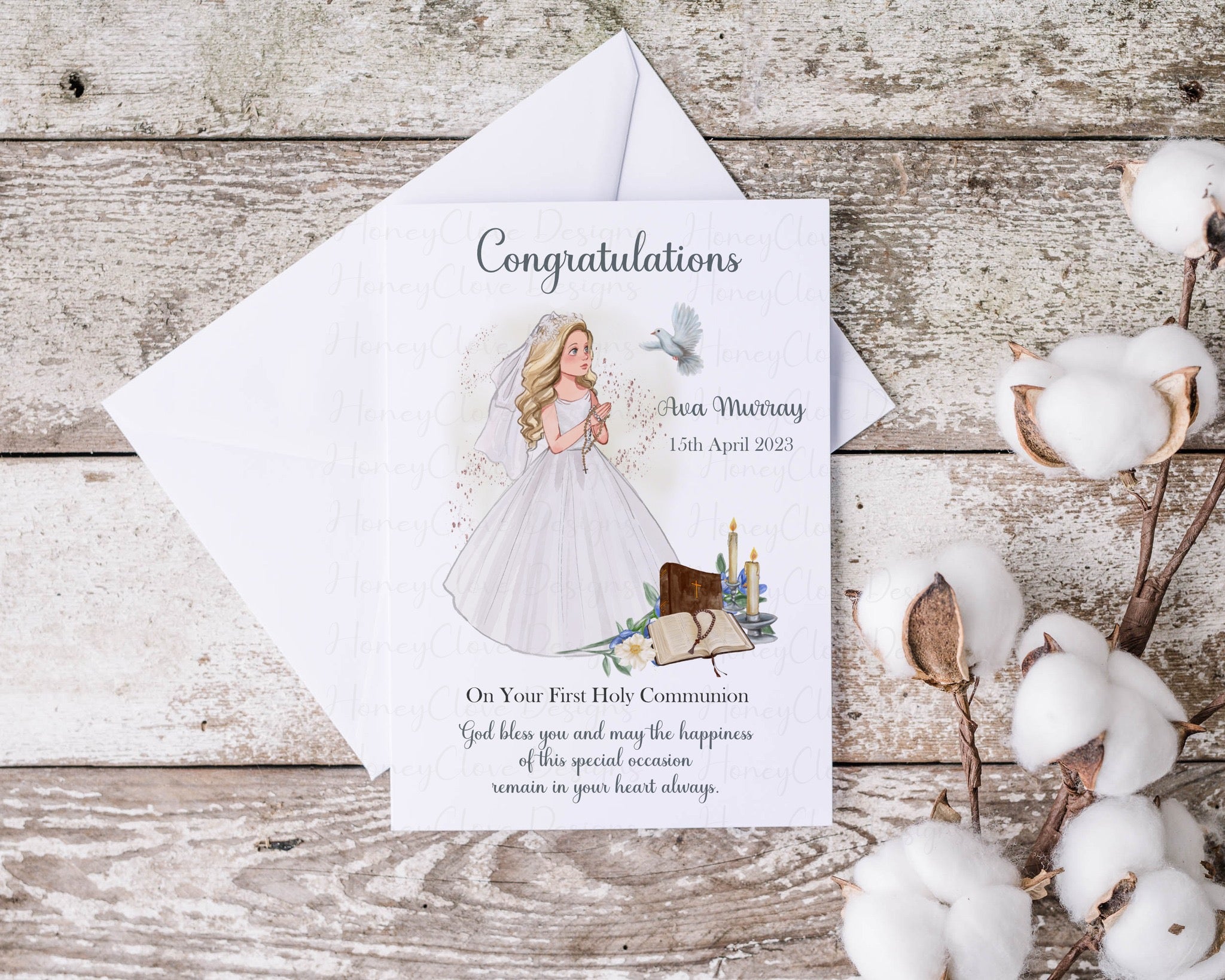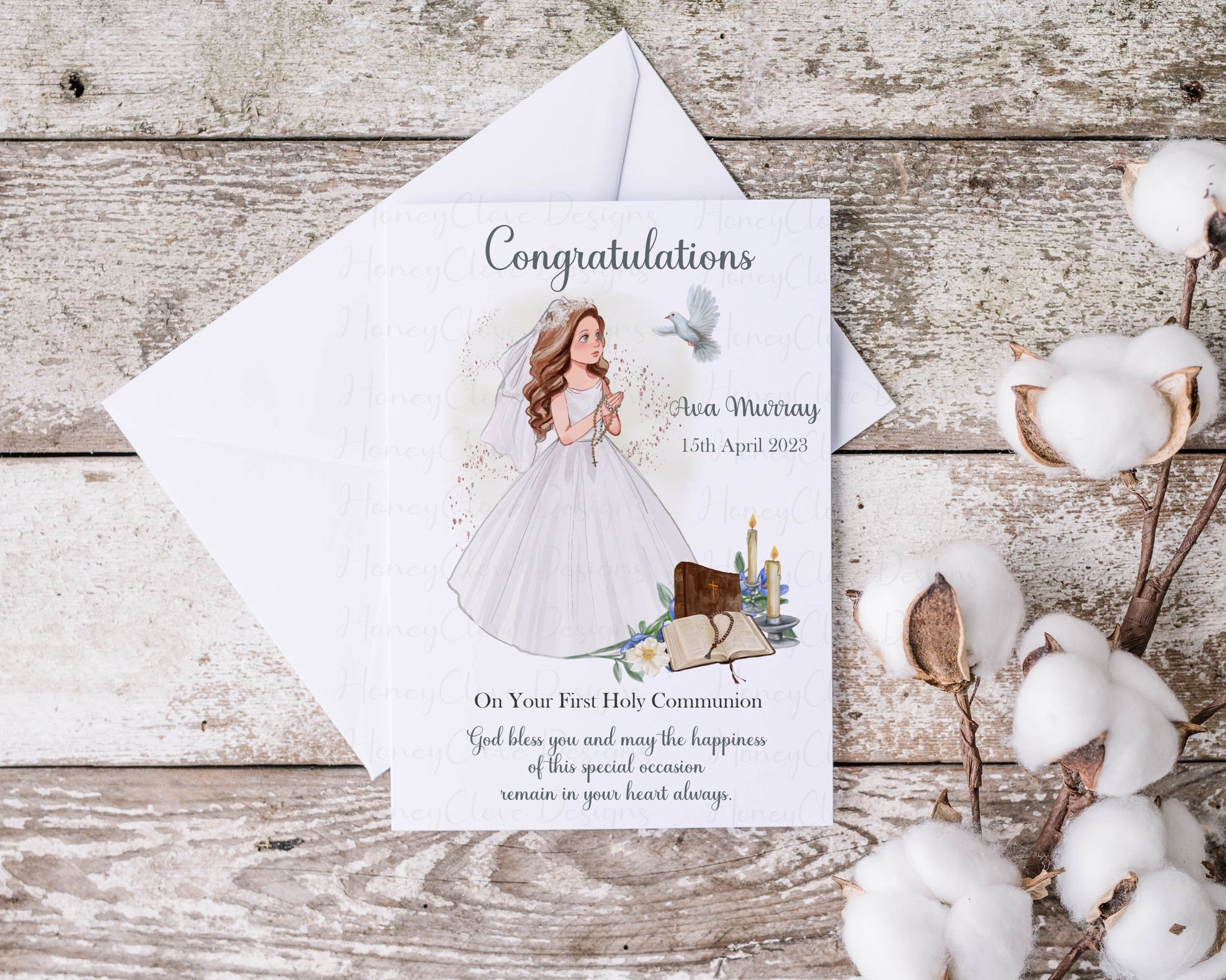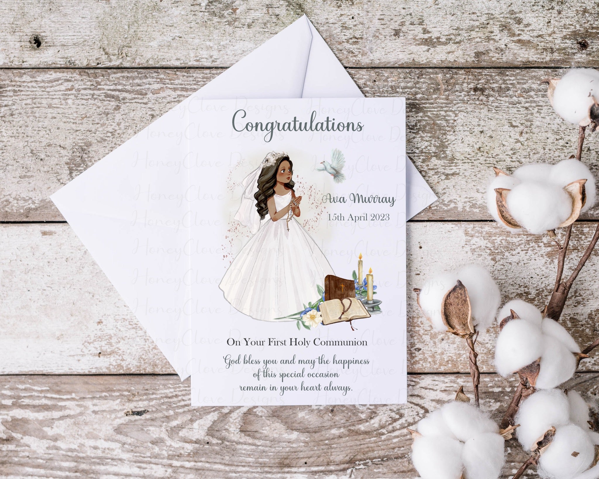 Gorgeous new communion girl design on a 5x7" size linen card. Personalised to suit. Please specify exactly what you would like on the front of the card, in the personalisation box.