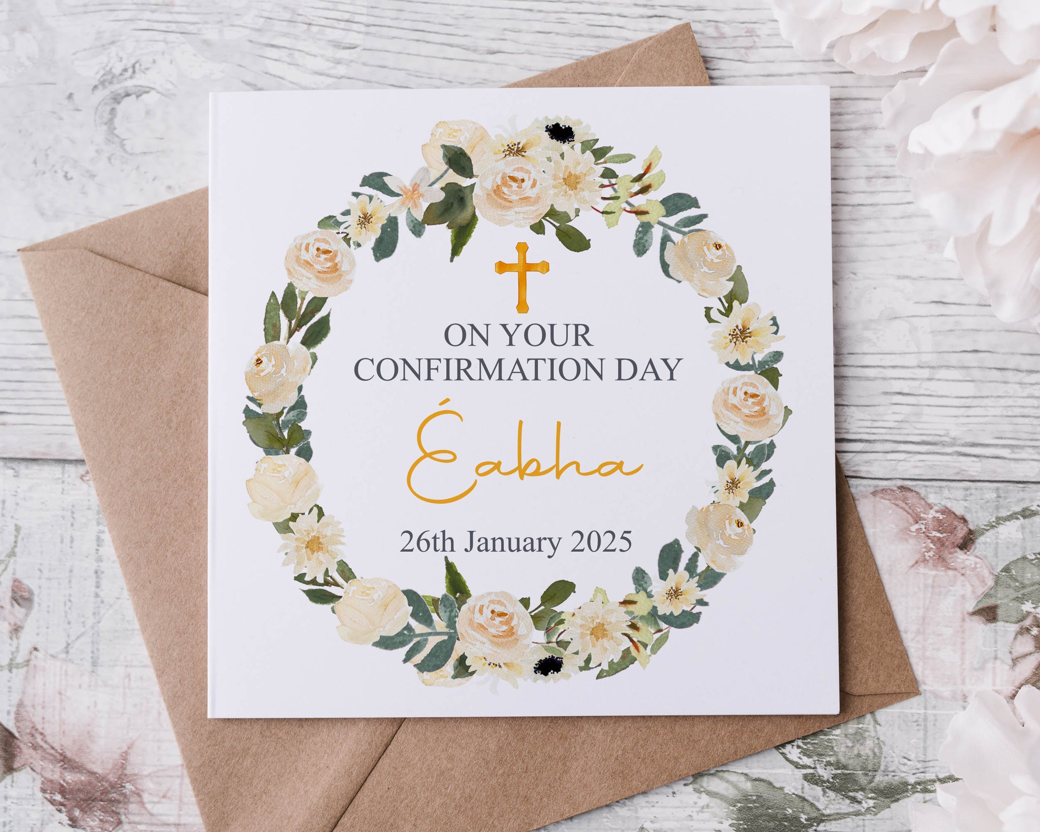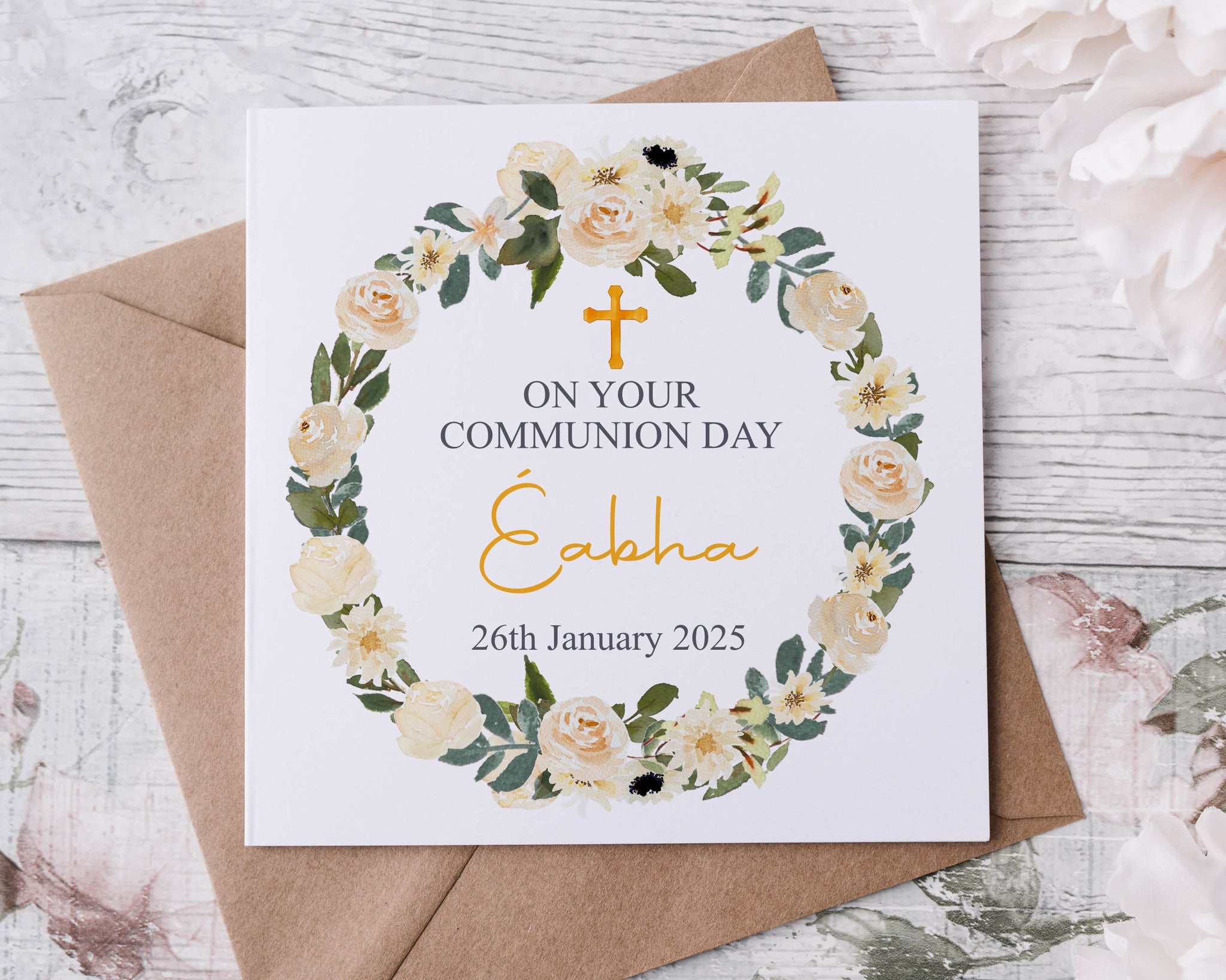 Unique and special greeting card for a First Communion or Confirmation. 6x6" size linen card. Please specify full name and date of communion/confirmation in the personalisation box. Matching items available.