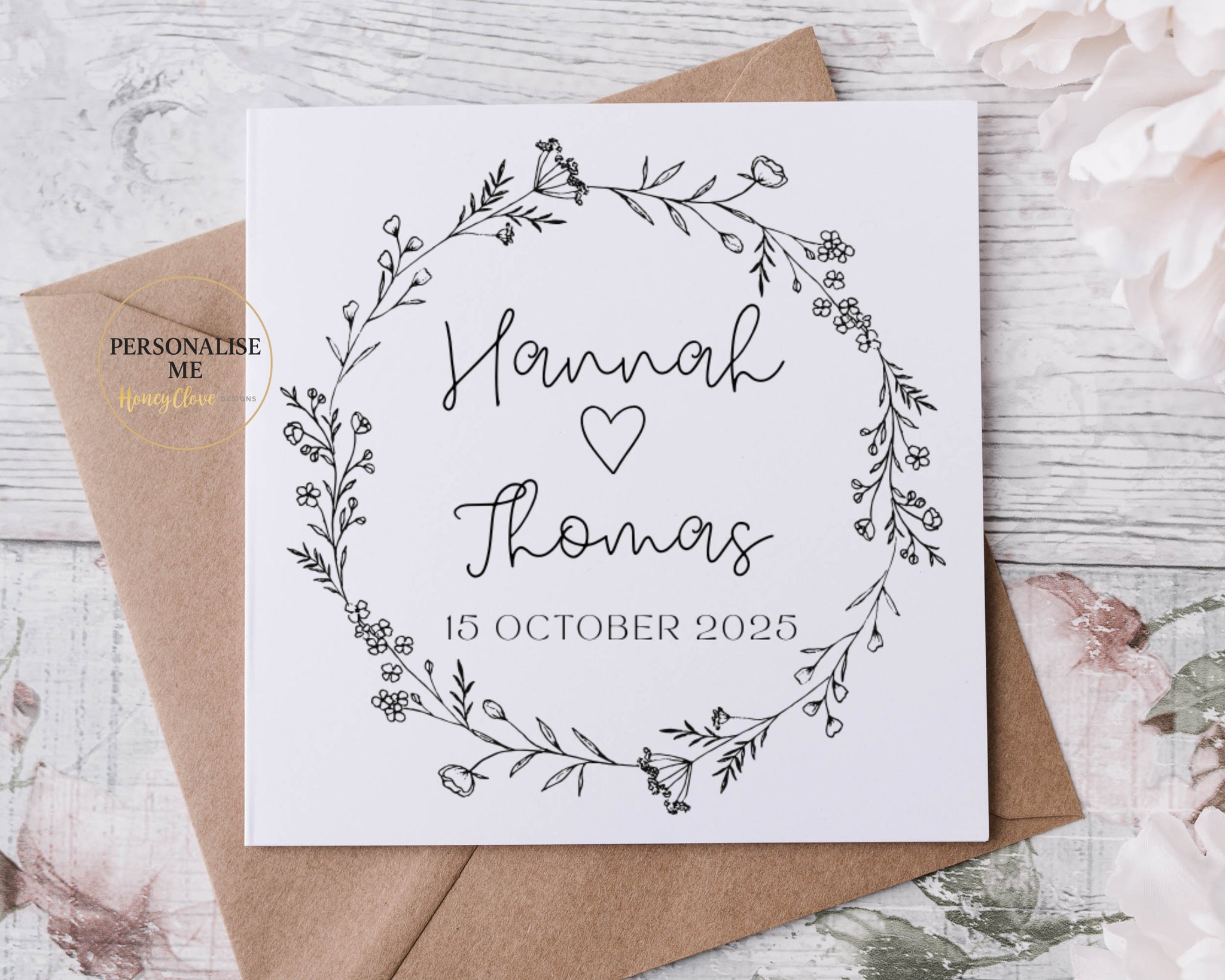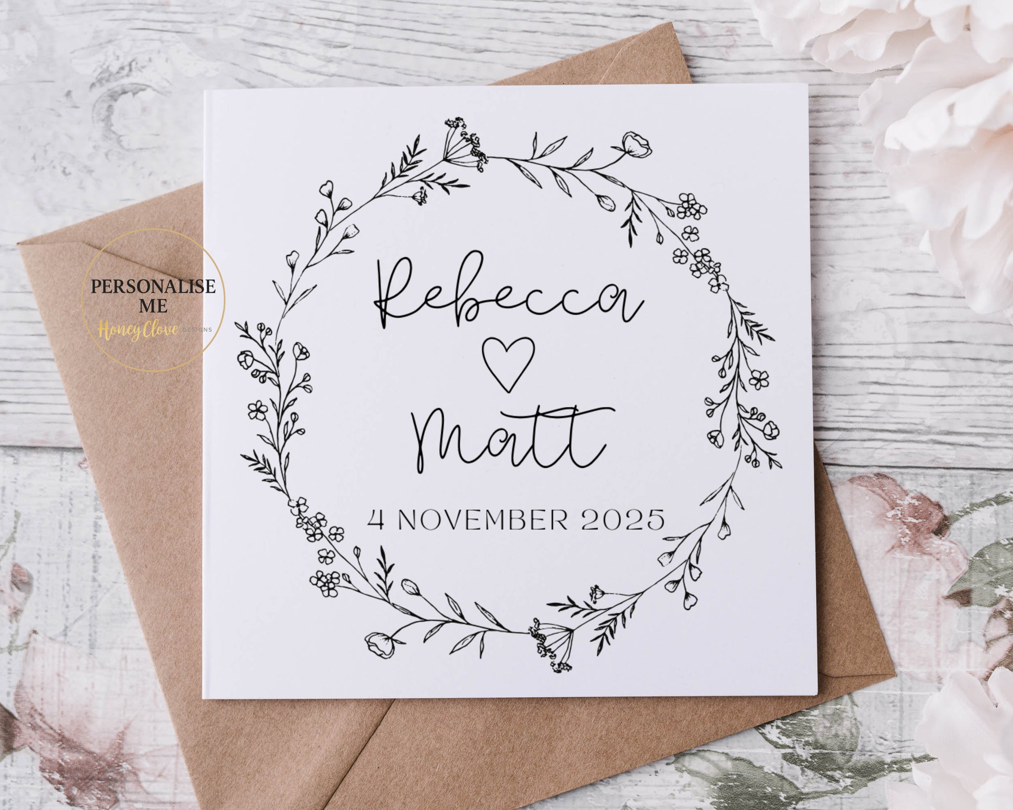 Celebrate love with this beautifully personalised card, perfect for weddings, anniversaries, or engagements. Featuring a delicate floral wreath and custom names with your special date, this 6-inch square card is printed on premium hammered cardstock for a luxurious textured finish. Comes with a crisp white envelope, ready to gift or post.