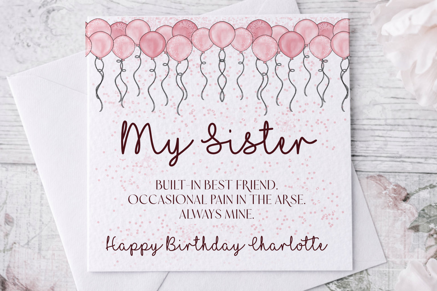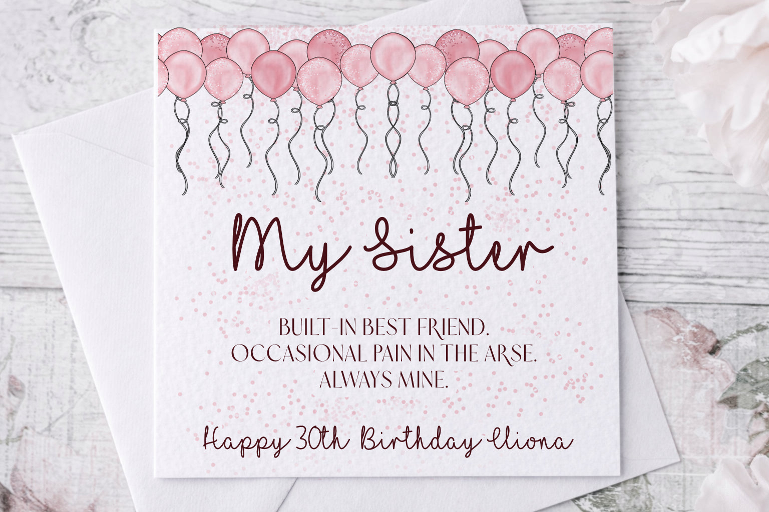 Perfect for sisters who appreciate humour with heart, this design can be personalised with the recipient’s name and birthday wording, making it a thoughtful keepsake as well as a good laugh.