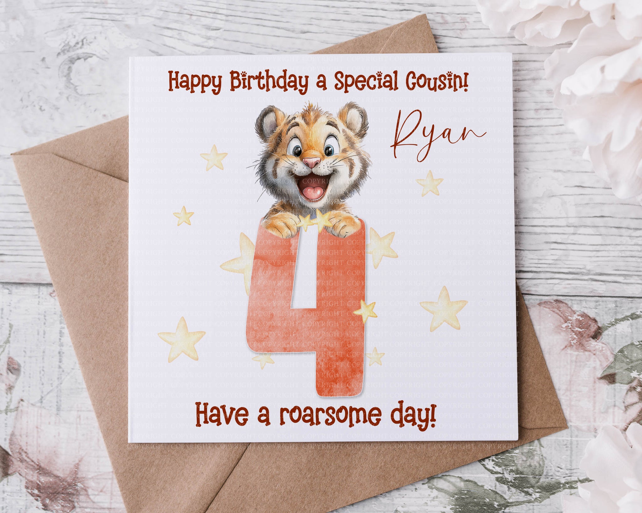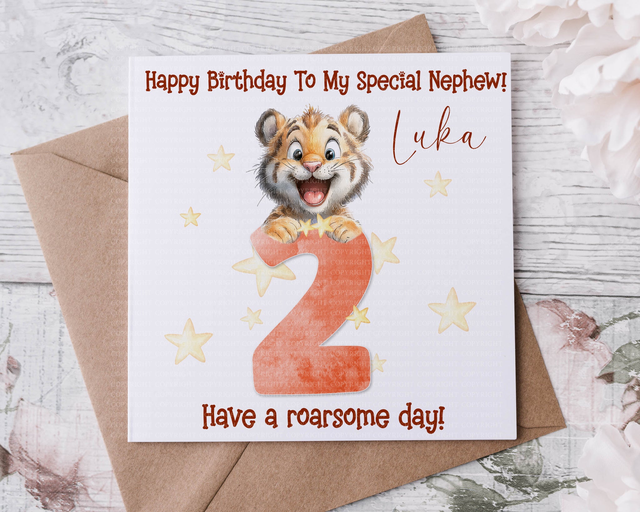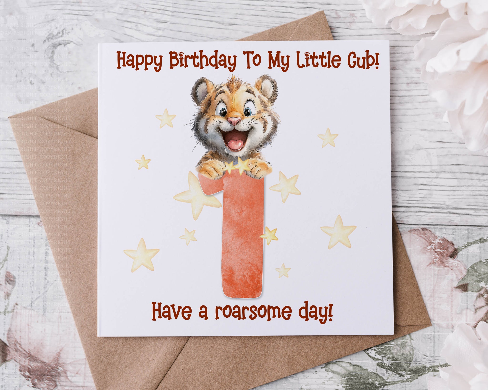 Make their birthday roar-some with this playful handmade card featuring a cheerful tiger cub, bright stars, and a bold number design. Crafted on premium hammered cardstock, this 6" square card is ideal for nephews, sons, grandkids—or anyone who loves a fun and vibrant celebration.