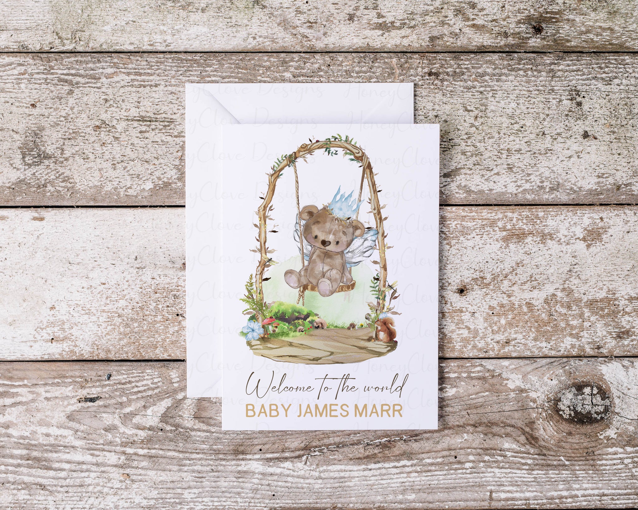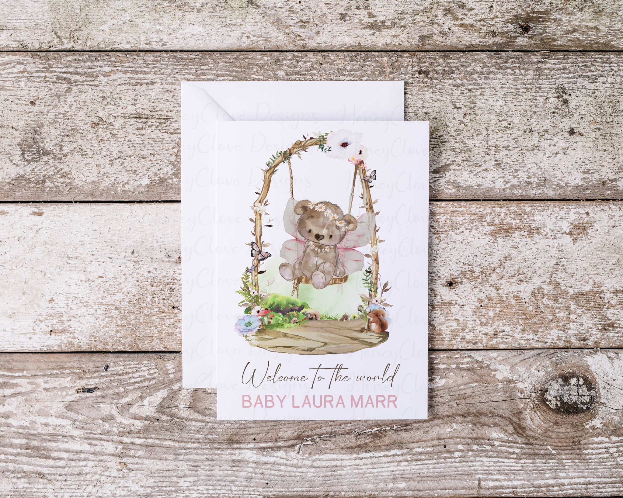 Beautiful new range to HoneyClove Designs! This teddy bear on a swing design comes in pink & blue colourways. Printed on C5 linen card, this can even be framed afterwards! Matching items available.