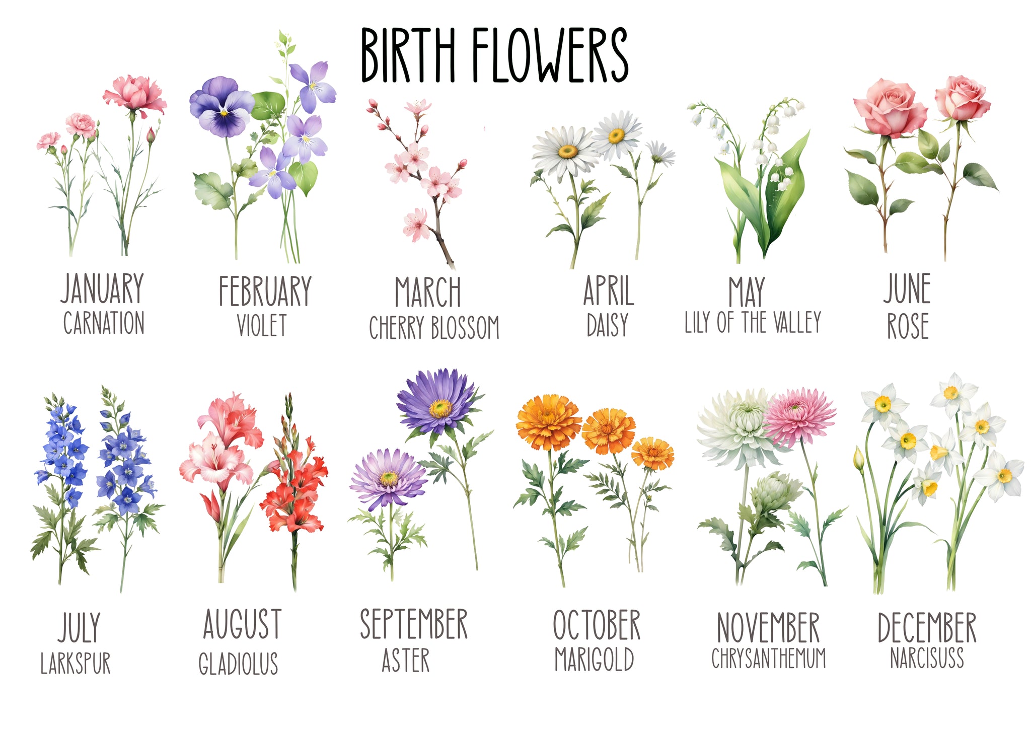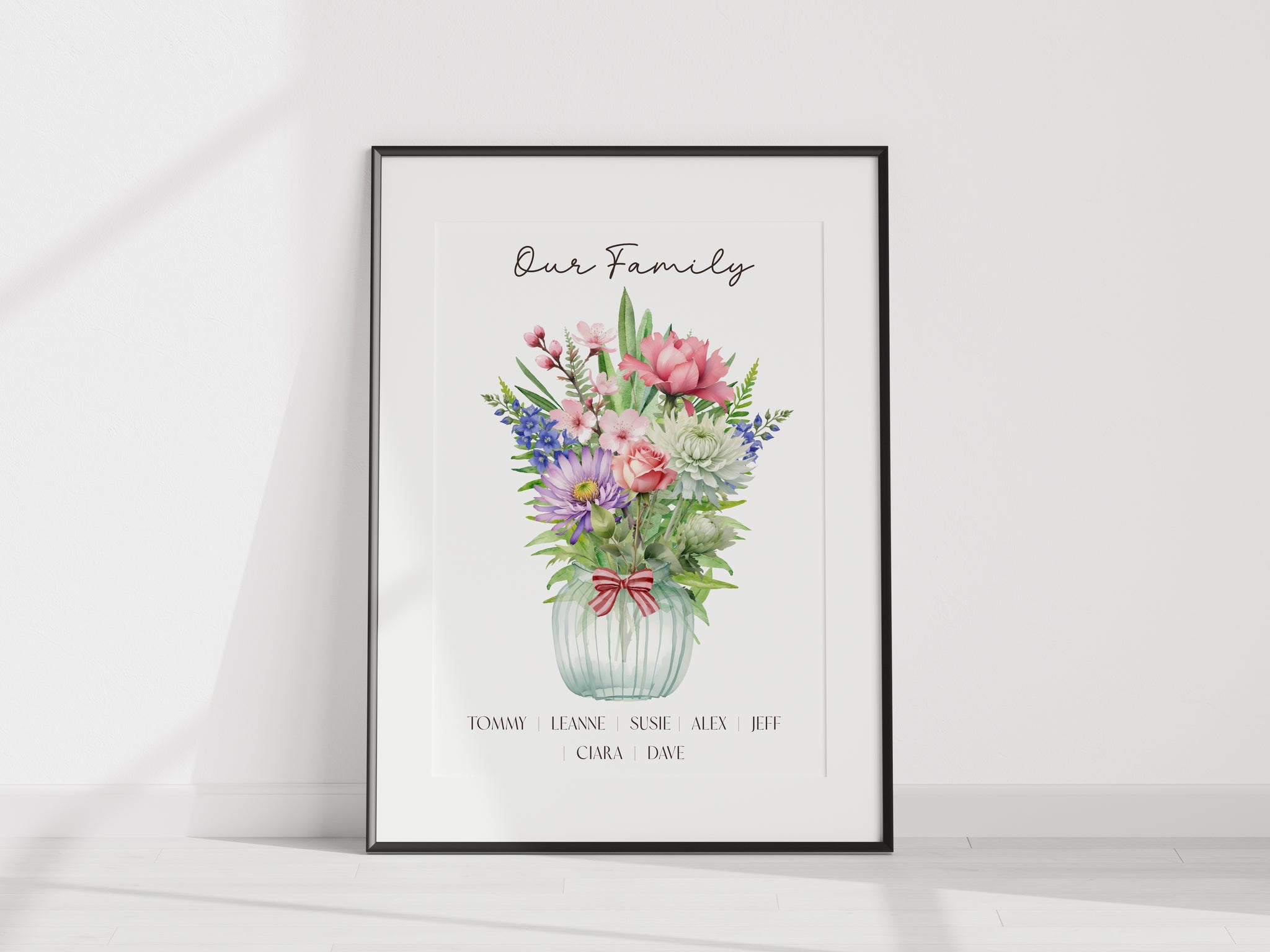 This print is fully personalised with the BIRTH FLOWER of each person depicted. The name of the person forms the stem. This print is ideal for larger families! However any gaps will be filled with green foliage.