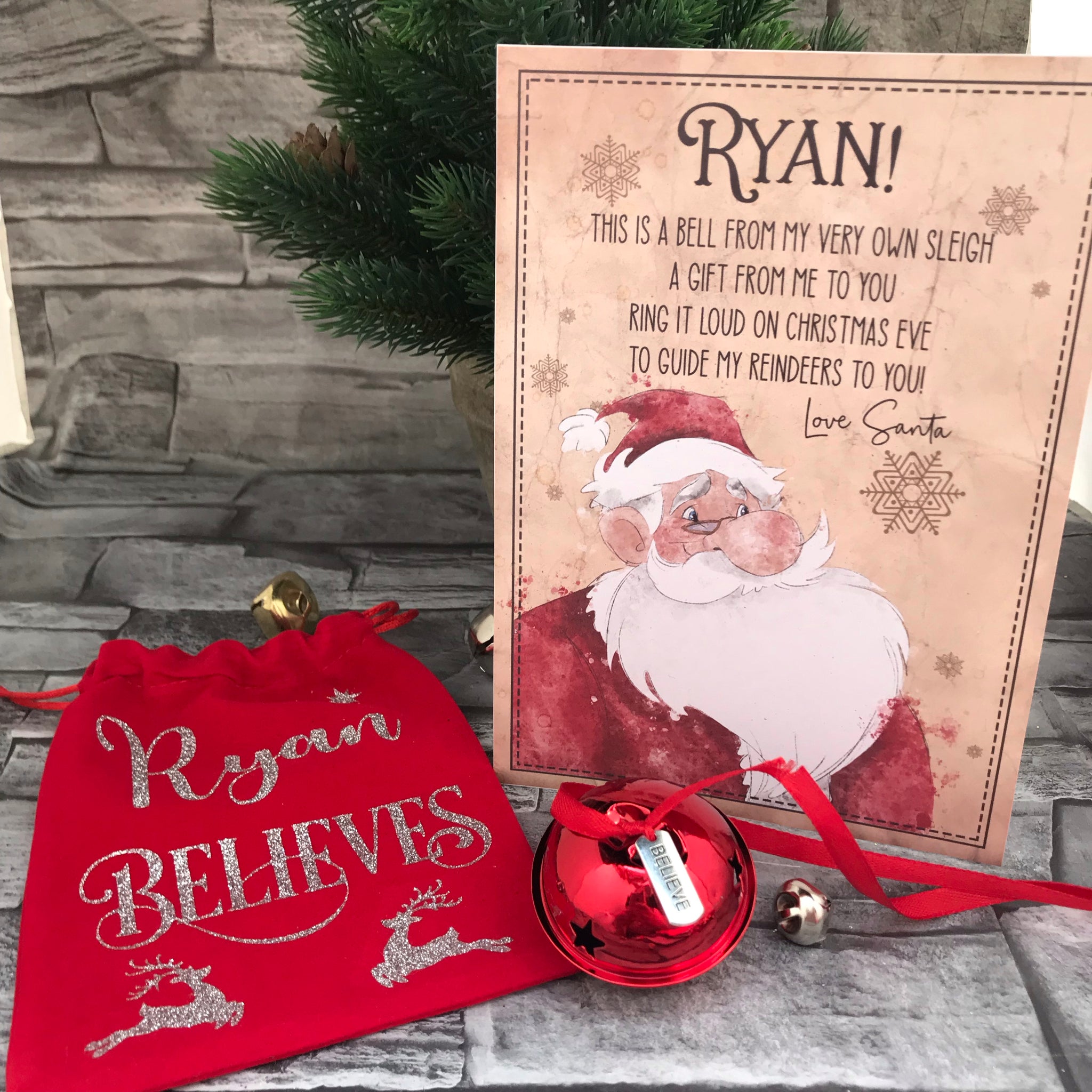 Also with this set comes a small red personalised, red velvet effect pouch, to keep the bell safe. Finally, a personalised letter completes the set. Wording can be changed should you wish, just please ensure all spellings, including grammar are accurate as your wording is copy and pasted. Very limited supply. Please note shape of red bag may change from pics due to availability. Gold bell will have gold writing on bag.
